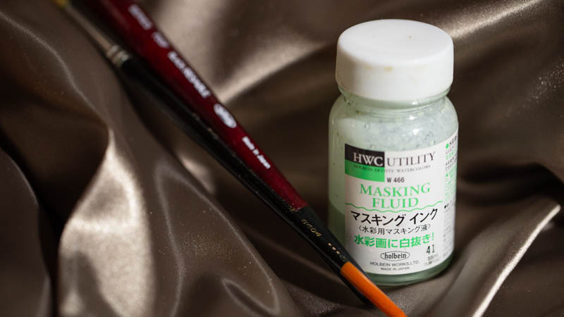 今回使用したホルベインのマスキングインク。なんというか、表面張力が強い感じで、ボタッと垂らすと盛り上がってしまうんですよね。
