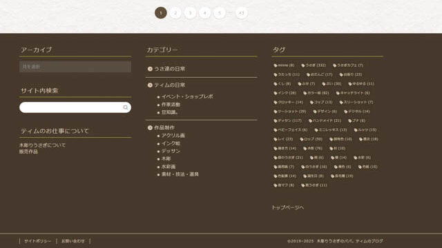 この茶色と黄緑をメイン、サブにしてブログの配色を決めていきました。茶色を暗くして文字を明るく抜いた部分(末尾のフッターなど)でメリハリをつけています。