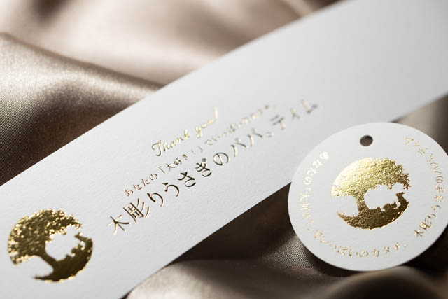 画用紙のようなエンボス紙に金の箔押しでロゴとロゴタイプ、ブランドスローガンを配置。箔押しは金型を使って紙にプレスするように加工するので、印刷面に微妙な凹凸ができ、それが反射具合の違いとなってキラキラ光ります。箔プリントと箔押しの違いですね!