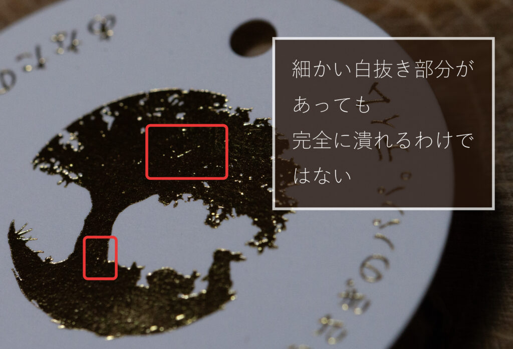 ネットを見ると、今回のロゴデザインのように細かい模様は箔だと細部がつぶれやすい、と書いてあるんですよね。それがどの程度なのか…。