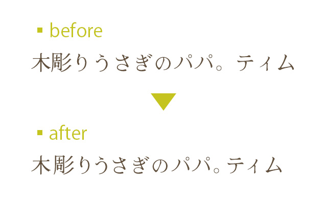 beforeは「木」と「彫」の間が詰まりすぎていること、「。」と「テ」の間が空きすぎていることなど、お気づきになられましたか?なんだ!こんなことができるなら早くいってよ!って感じで目から鱗でした。