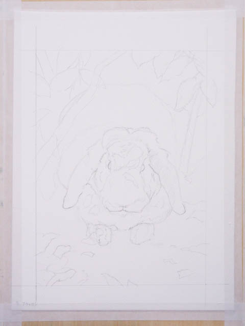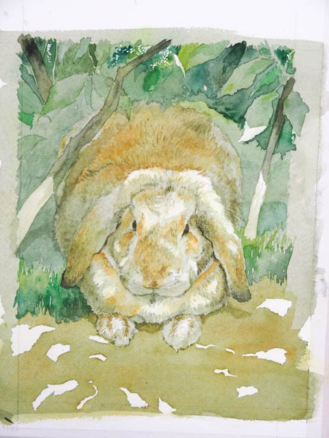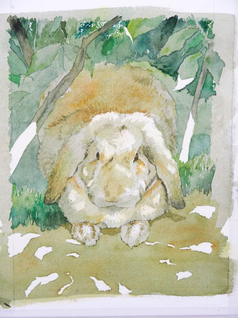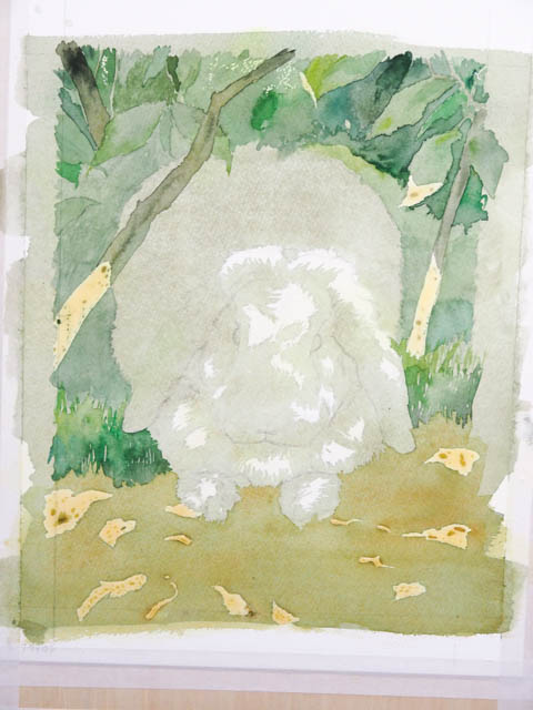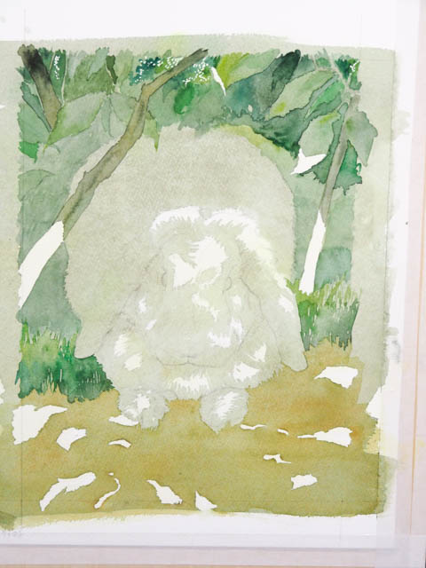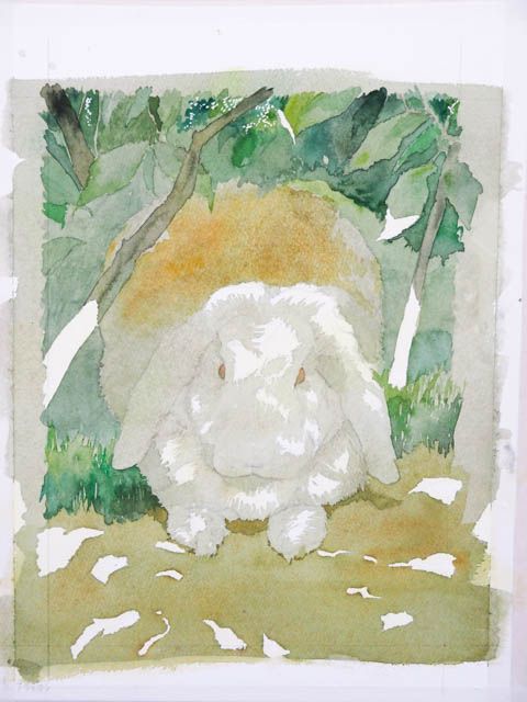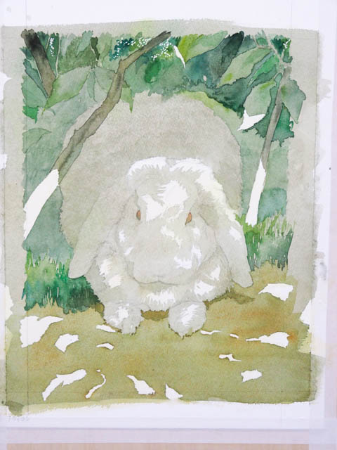 また、木洩れ日の形がおかしいと非常に不自然になってしまいます。うさぎさんという、立体の上に落ちる光なので、光の部分の形がうさぎさんの表面の形に添って変わりますよね。考えただけで難しそう…。