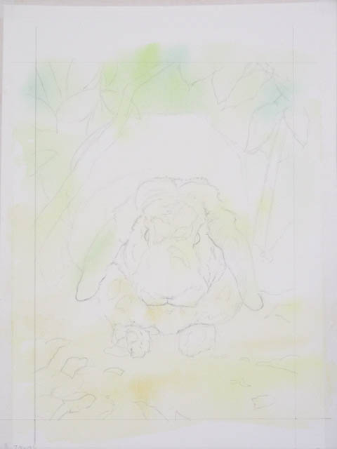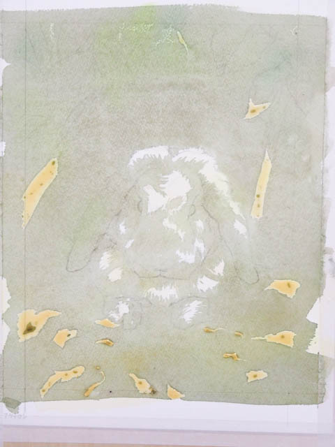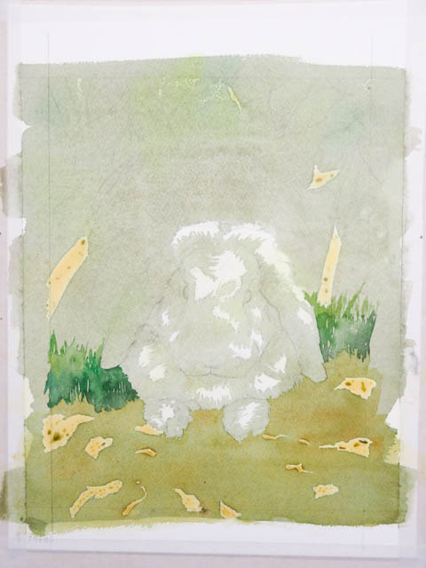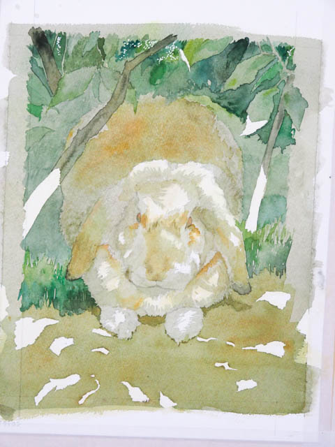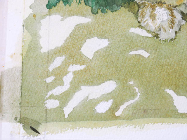 今描いた部分がこの絵の中で最も明るい部分。最も明るくても、真っ白にはなりません。地面の黄土色や背景の緑を、微妙に色調を変えてぼかしました。続いてマスキング。