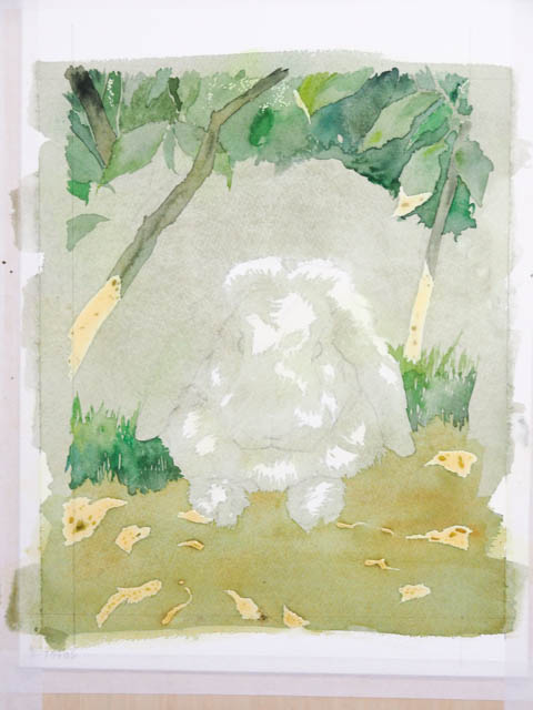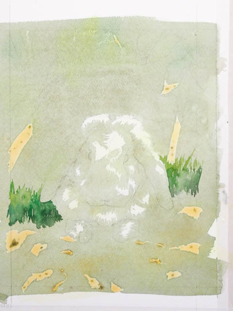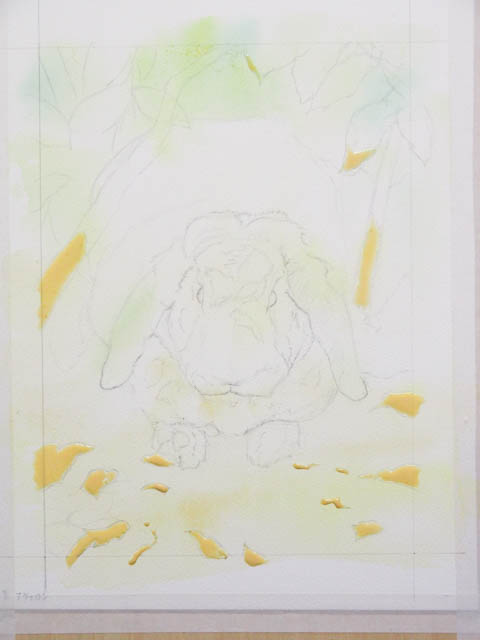 黄色く乗せたのがマスキングインクです。この上に絵の具を載せても、後でマスキングインクをはがすと塗る前の色が残ります。地面や背景の枝に落ちる光の部分をマスクしました。