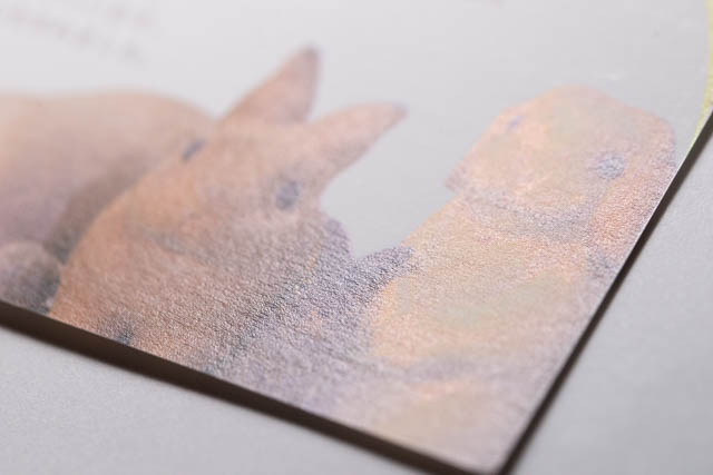 この紙は控えめなエンボスがとっても上品。触った瞬間、伝わる高級感。インクがよく乗って発色が良いです。(白く霞がかかったような発色の沈みがない)