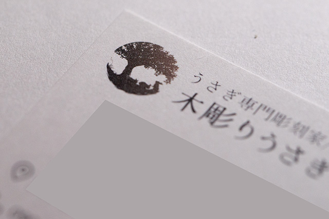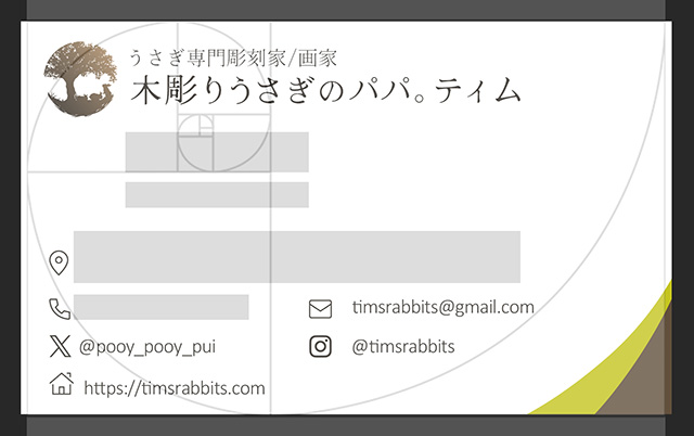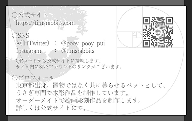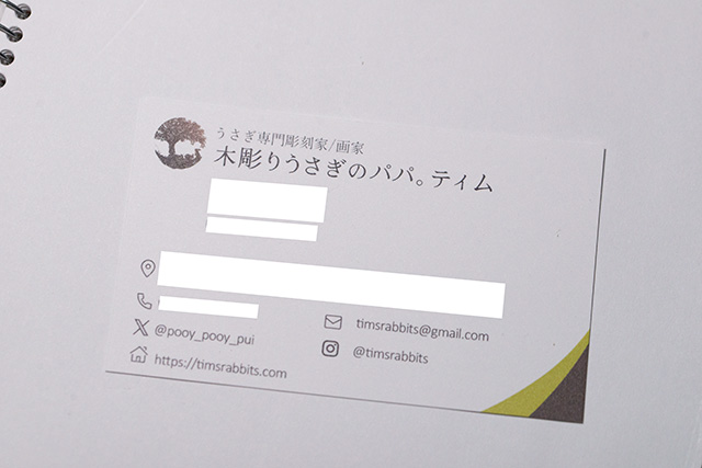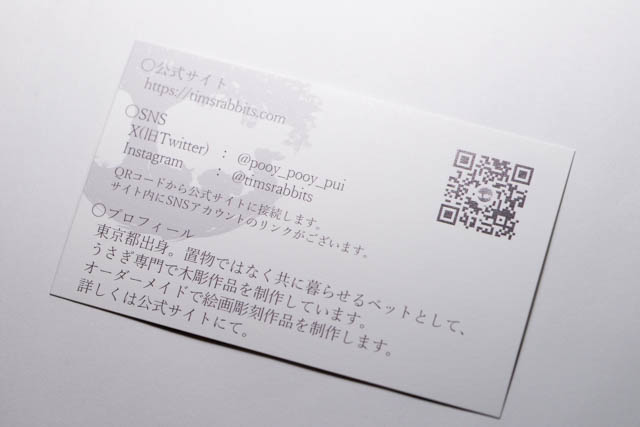 事業用名刺では屋号の上に「うさぎ専門彫刻家/画家」と入れていましたが、こちらではブランドスローガン「あなたの「大好き!」でいっぱいのカタチ。」に差し替え。