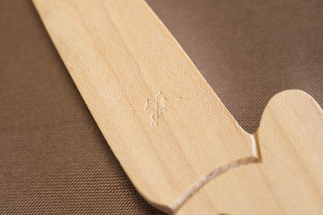 直筆サインをかたどった刻印を手作業で打ち込みました。ハンドメイドの証、ほかのお店では買えないプレミアムです。塗装ではなく凹凸で表す刻印は、控えめな主張でありながらも、いつまでも消えることなく残ります。