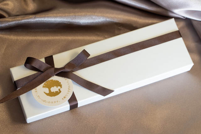 パールホワイトの箱に、ティムのイメージカラー、深いブラウンのリボンを合わせました。本作のために用意した箔押しのタグがアクセントです。