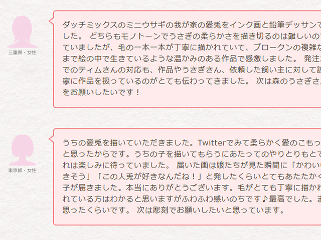 ダッチミックスのミニウサギの我が家の愛兎をインク画と鉛筆デッサンで描いていただきました。 どちらもモノトーンでうさぎの柔らかさを描き切るのは難しいのではないかと思っていましたが、毛の一本一本が丁寧に描かれていて、ブロークンの複雑な模様も愛兎そのままで絵の中で生きているような温かみのある作品で感激しました。 発注から手元に届くまでのティムさんの対応も、作品やうさぎさん、依頼した飼い主に対して誠実さが伝わって丁寧に作品を扱っているのがとても伝わってきました。 次は森のうさぎさんでカラーの作品をお願いしたいです!
